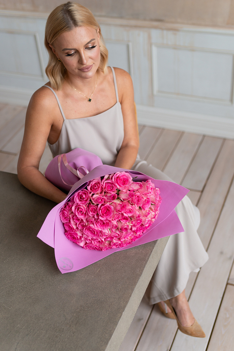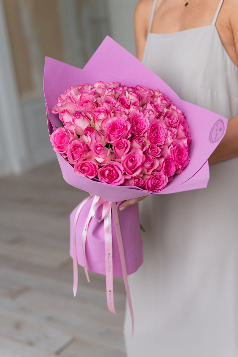 Букет доставляется в транспортировочном комплекте: "аквабокс + транспортировочная коробка-трапеция" или "аквабокс+фирменный пакет".