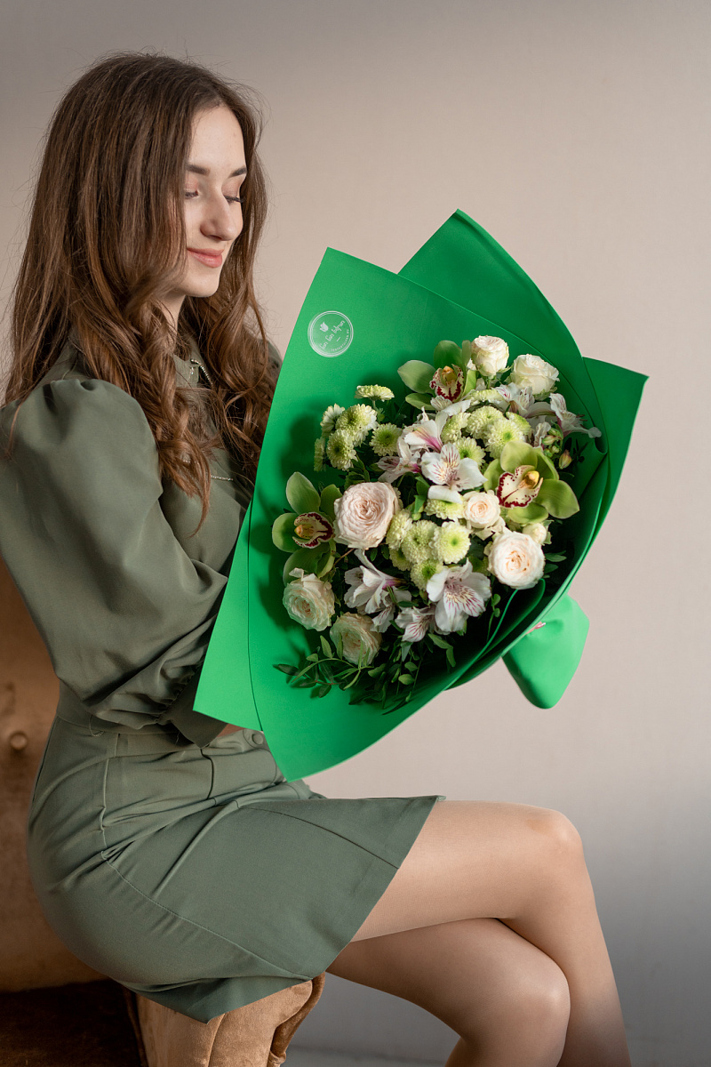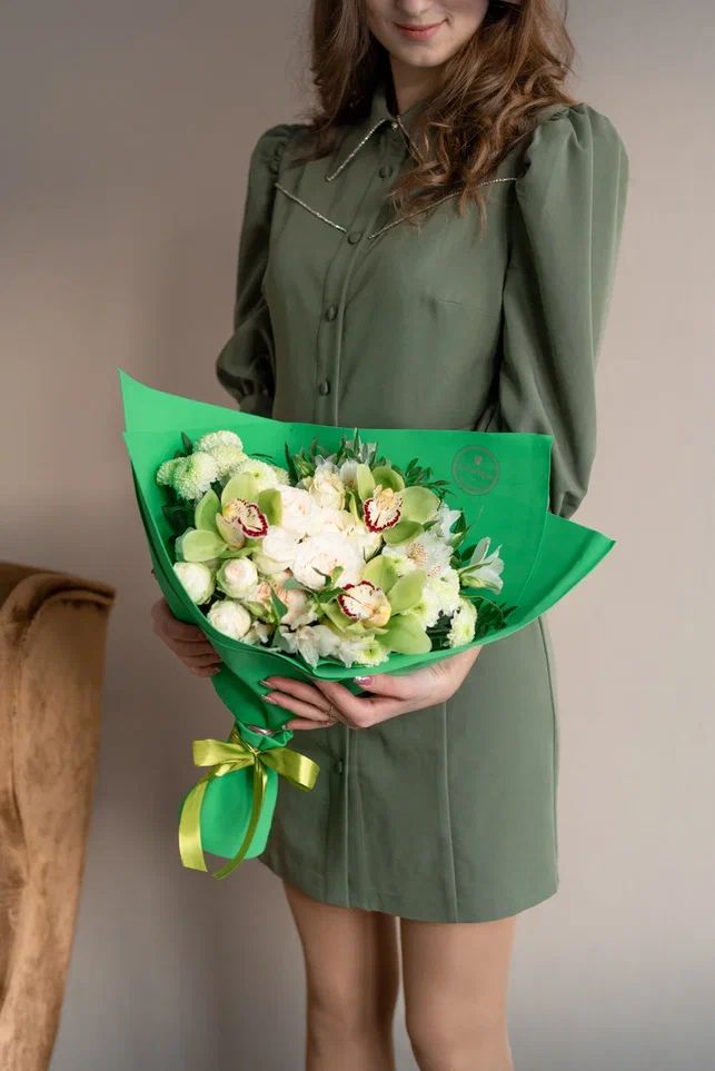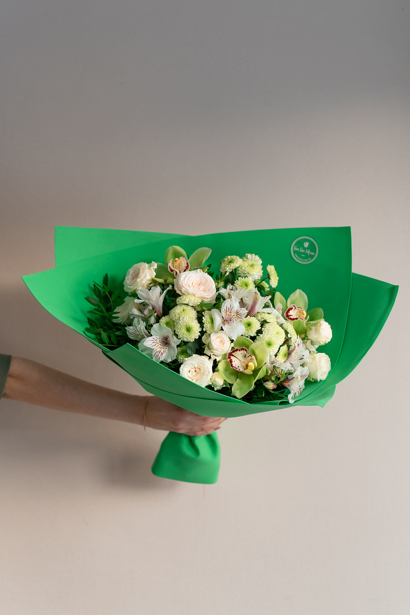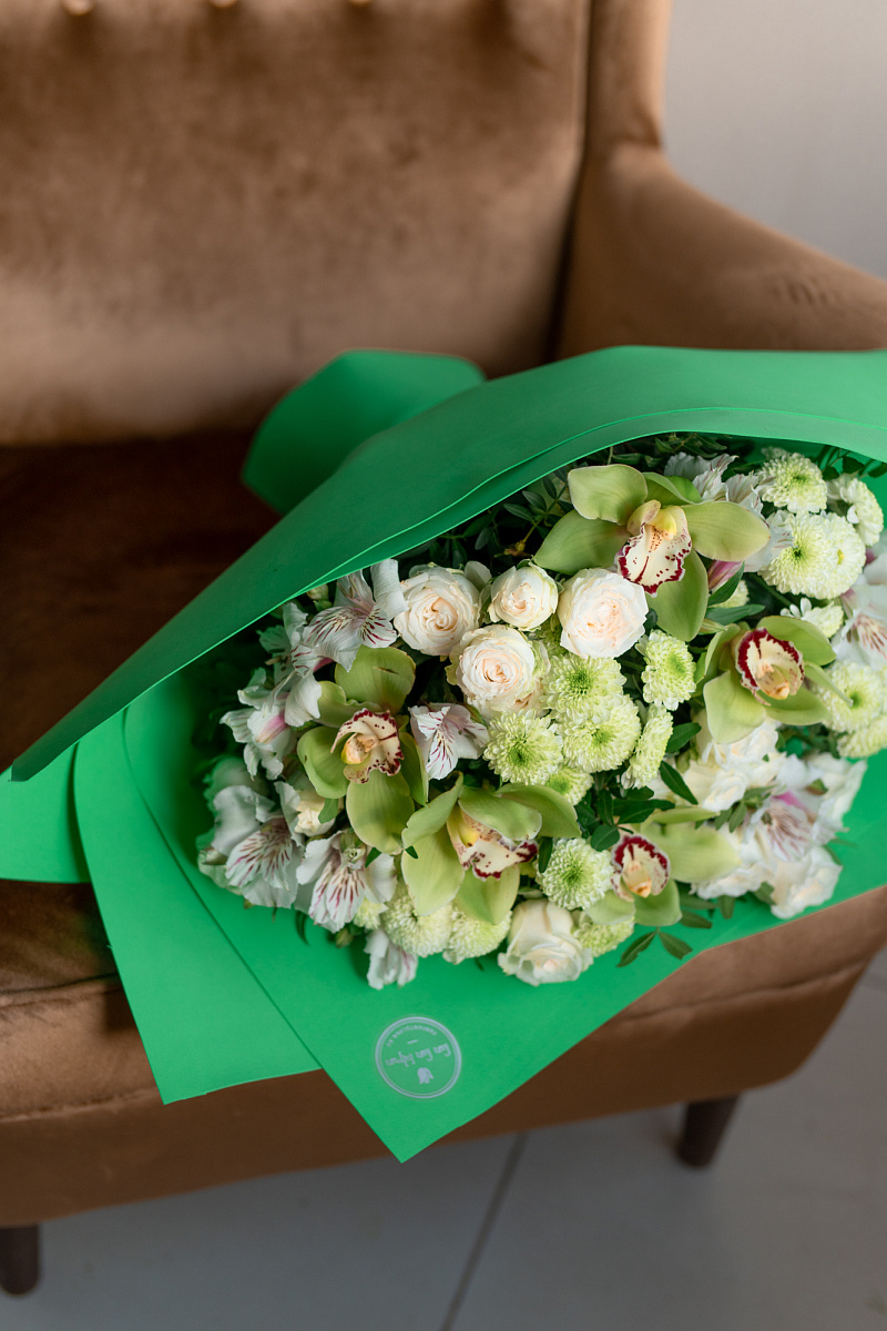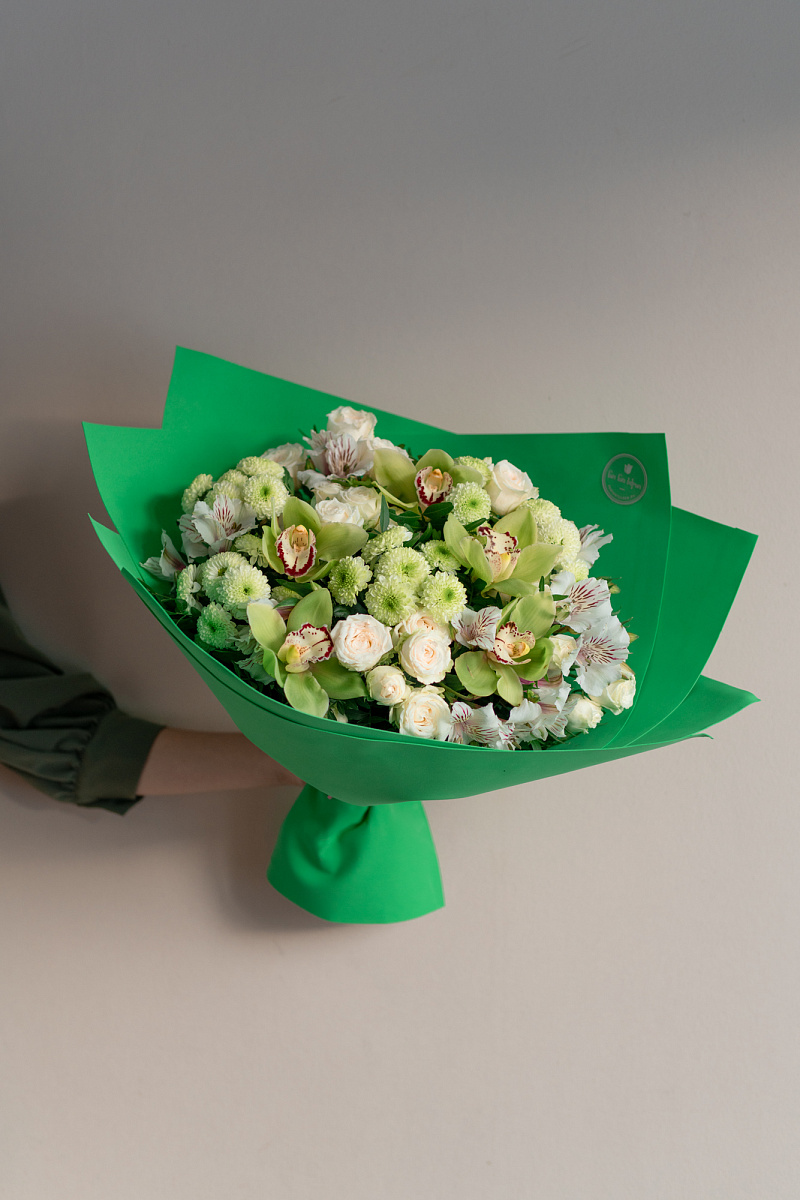 Волшебным мастерством флориста был создан непревзойденный букет, который уносит нас в мир таинственности и красоты. Сочетание зеленых орхидей, хризантем и кустовых роз превращает это произведение в истинное воплощение эстетического великолепия.