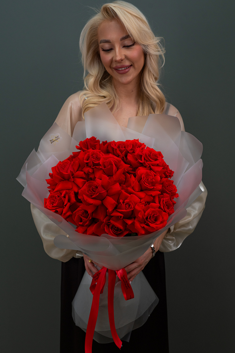 Это очаровательное собрание из 25 красных пышных роз создает яркий и выразительный аккорд красоты и страсти. Насыщенный алый оттенок подчеркивает силу эмоций и глубину переживаний, заставляя сердце биться чаще. Бутоны с округлой формой и плотной структурой выглядят особенно эффектно благодаря шелковистой фактуре лепестков и глубокому благоуханию.