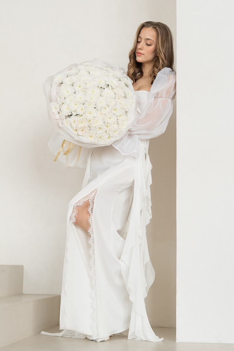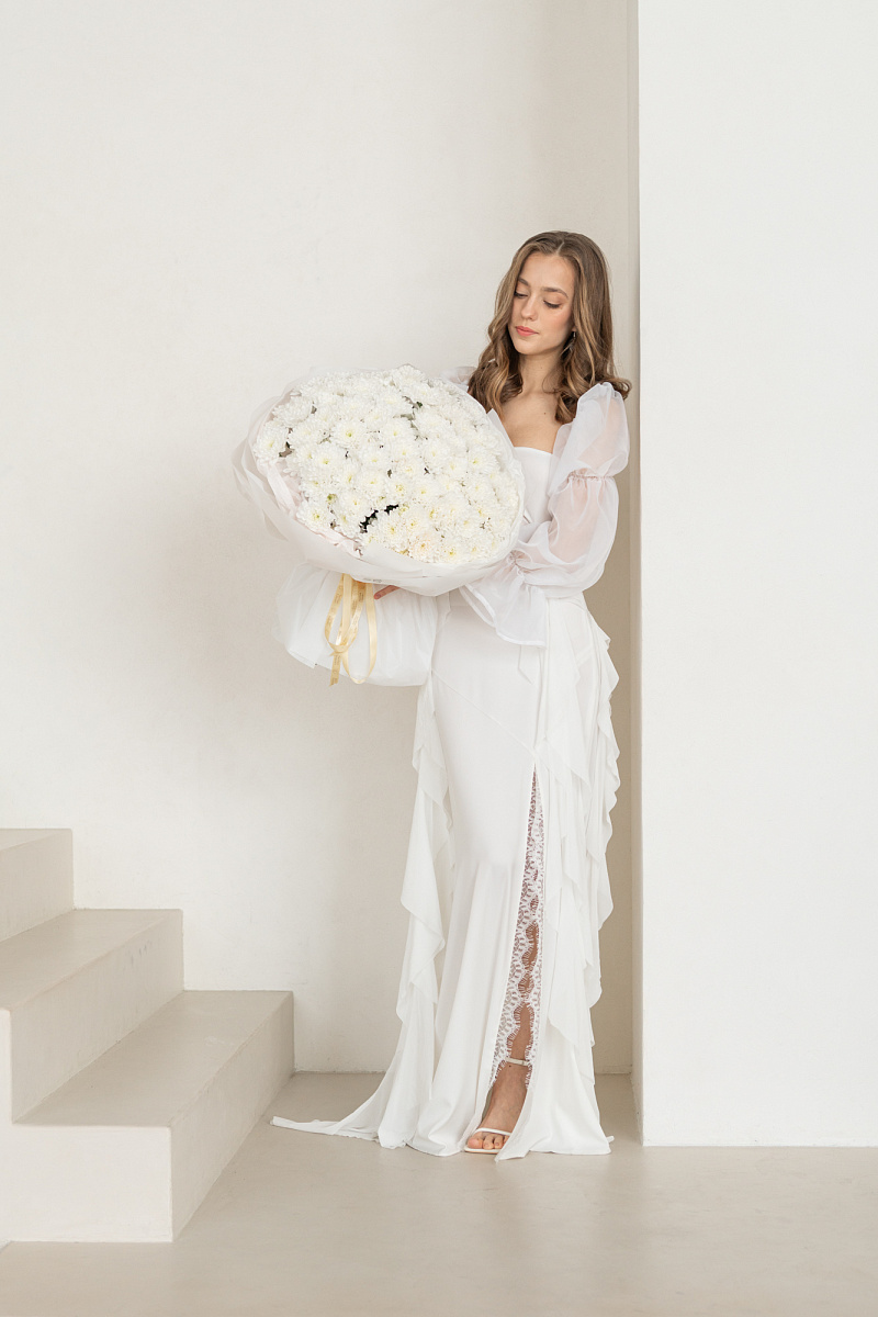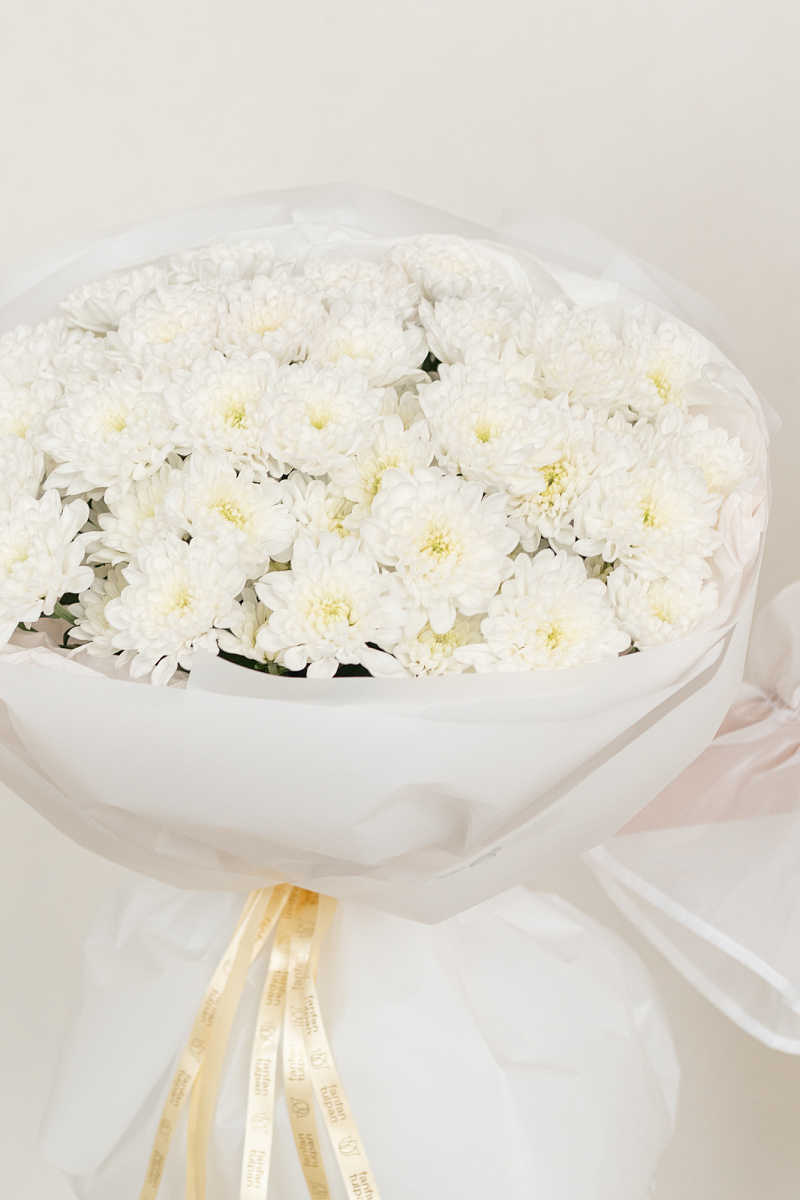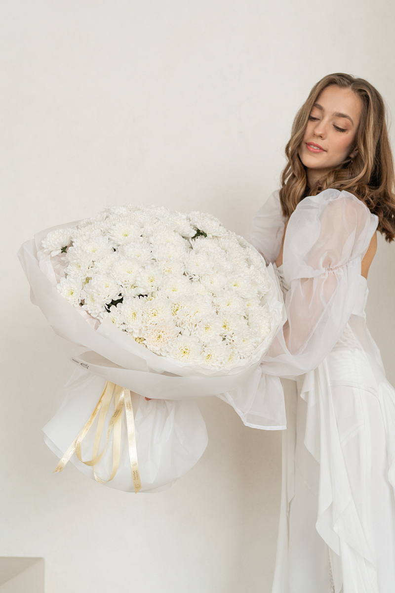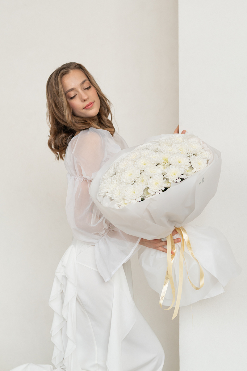 Букет из белых хризантем - как несказанное признание в искренних чувствах. Каждый цветок словно шепчет о чистоте помыслов и глубине эмоций. Подарите этот символ нежности тому, кто занимает особое место в вашем сердце.