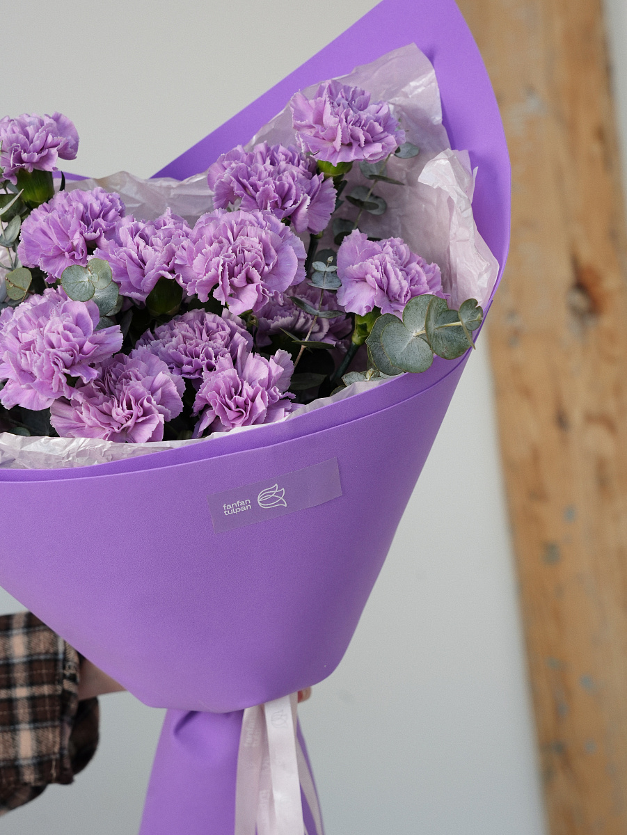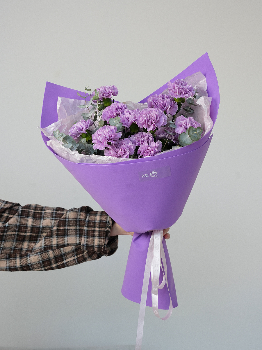 Букет из сиреневых гвоздик выглядит элегантно и изыскано. Сиреневый цвет символизирует утонченность, нежность и романтику.