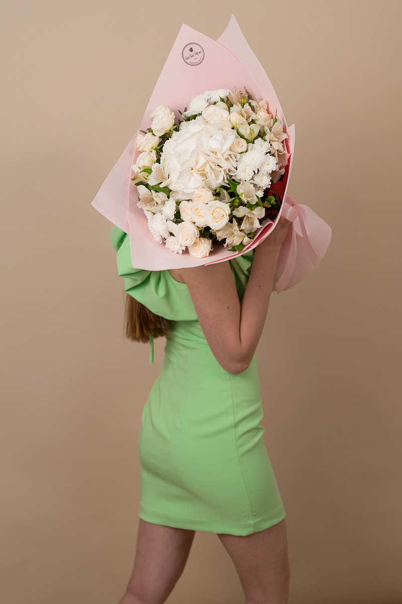 Волшебный букет, состоящий из изысканных белоснежных гортензий и нежных кустовых роз, пробуждает в сердце ощущение благородства и красоты. Каждый цветок в этом букете словно дарит свой неповторимый шарм, создавая прекрасное сочетание мягкости и изящества.