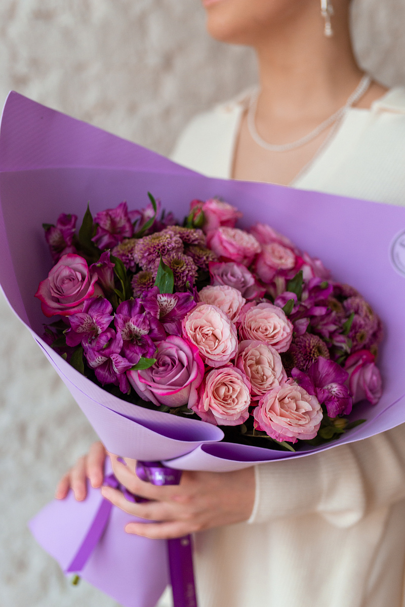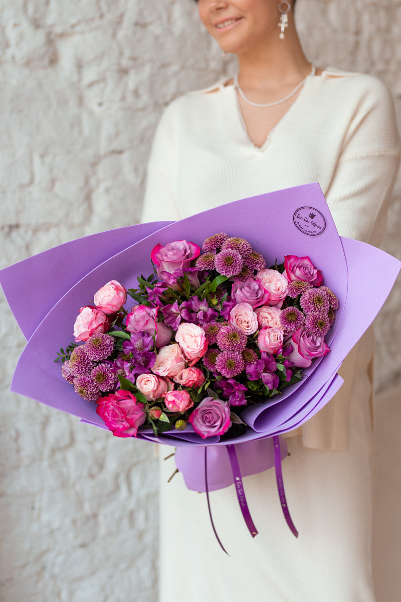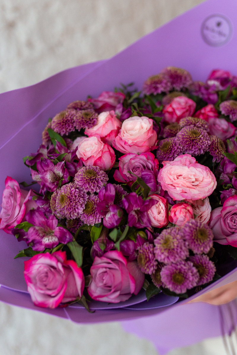 Букет включает в себя красивые лиловые розы deep purple, которые придают ему загадочности и изысканности. Их глубокий фиолетовый оттенок притягивает внимание и создает особую атмосферу. В композицию также входит прекрасная сиреневая хризантема сантини, дополняющая букет свежими и нежными нотками. Она придает ему легкости и воздушности, добавляя изящество и грацию. Наконец, кустовая роза, украшая данную композицию, придает ей еще больше роскоши и элегантности.