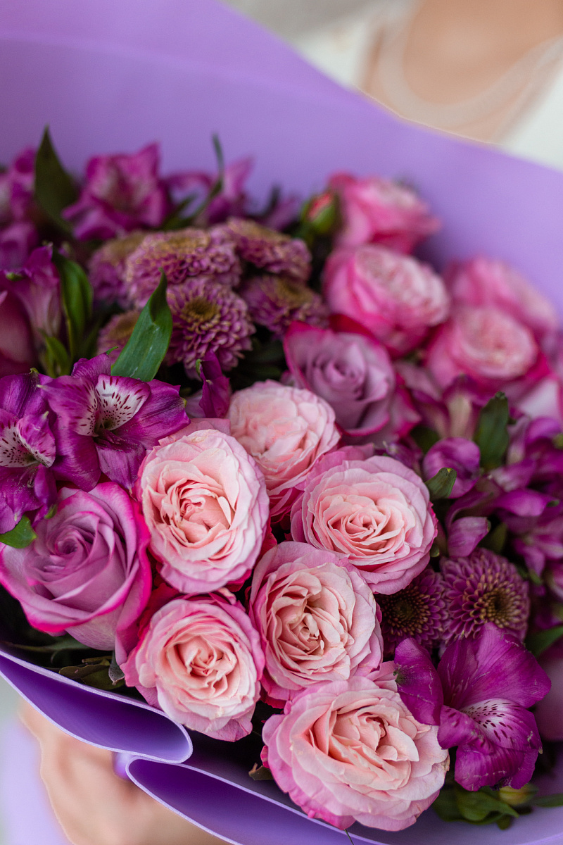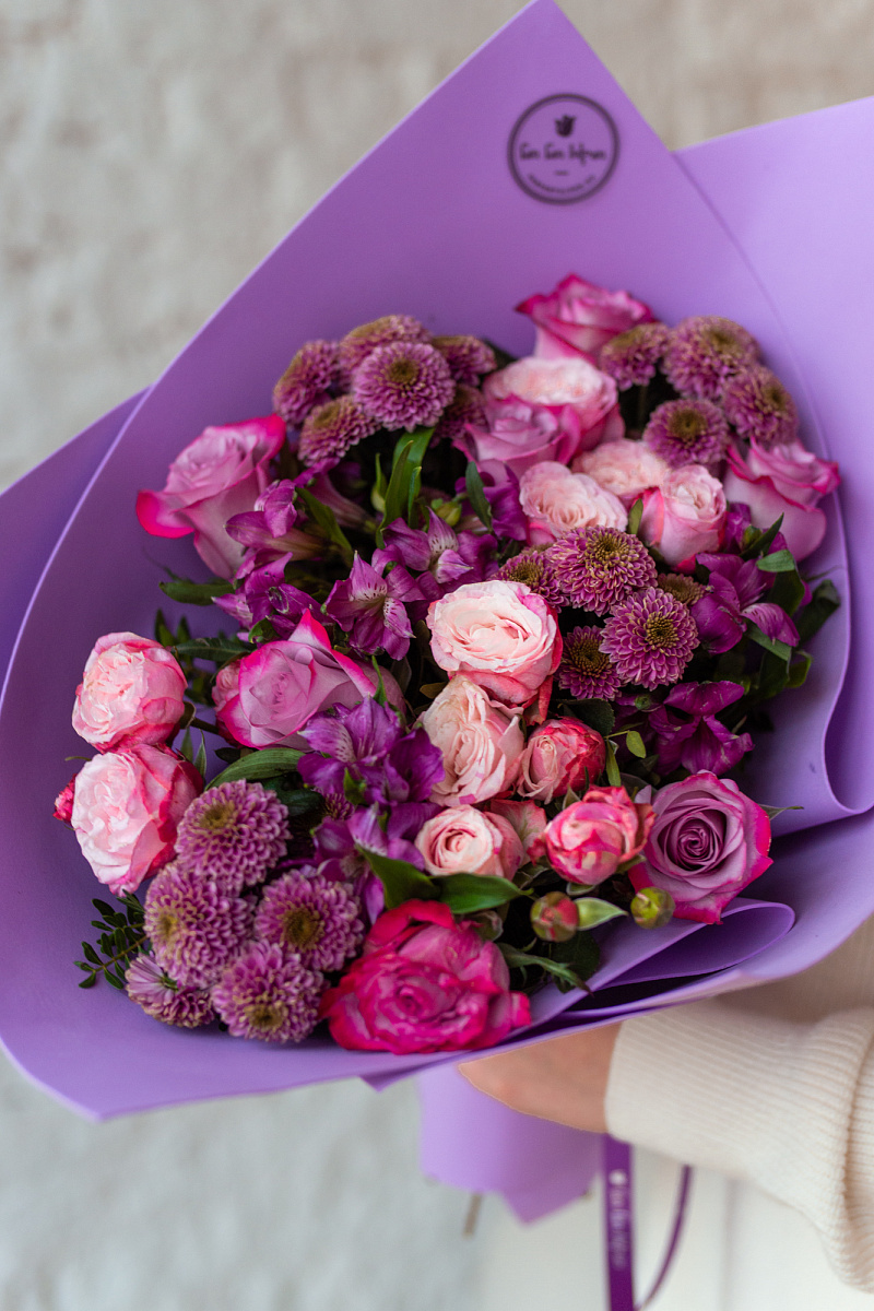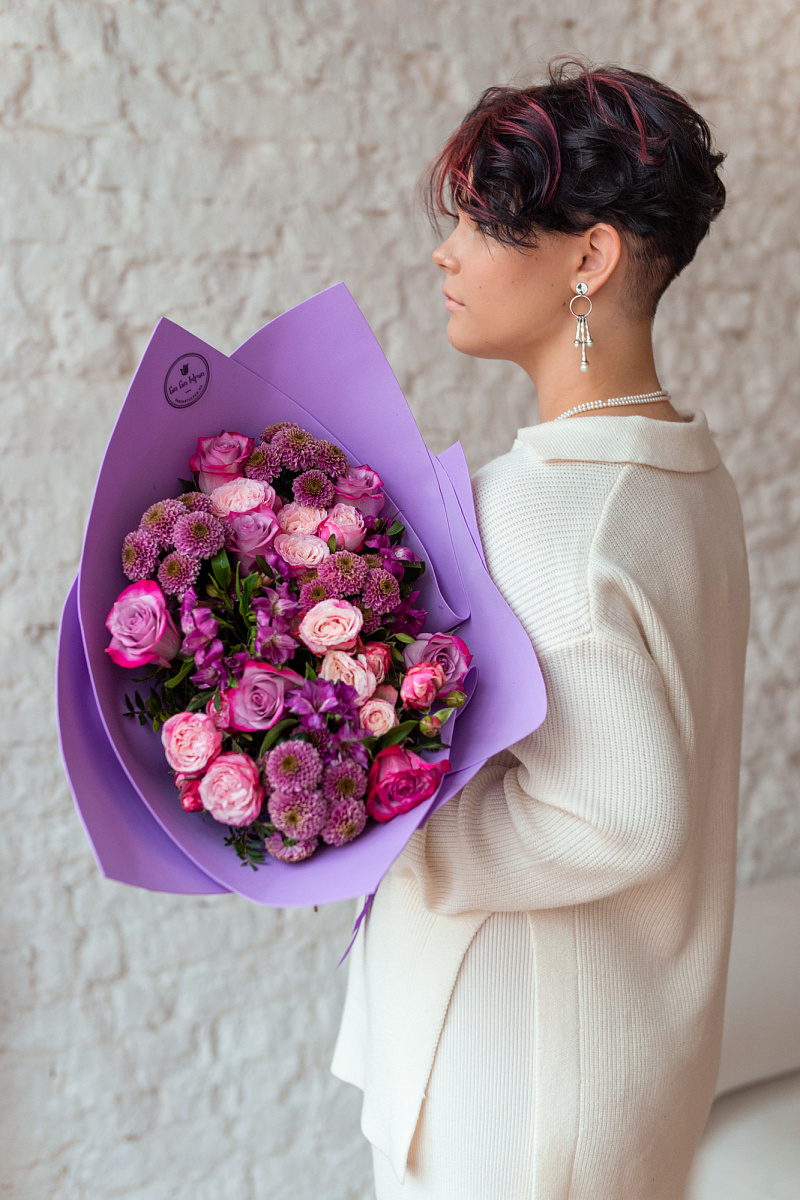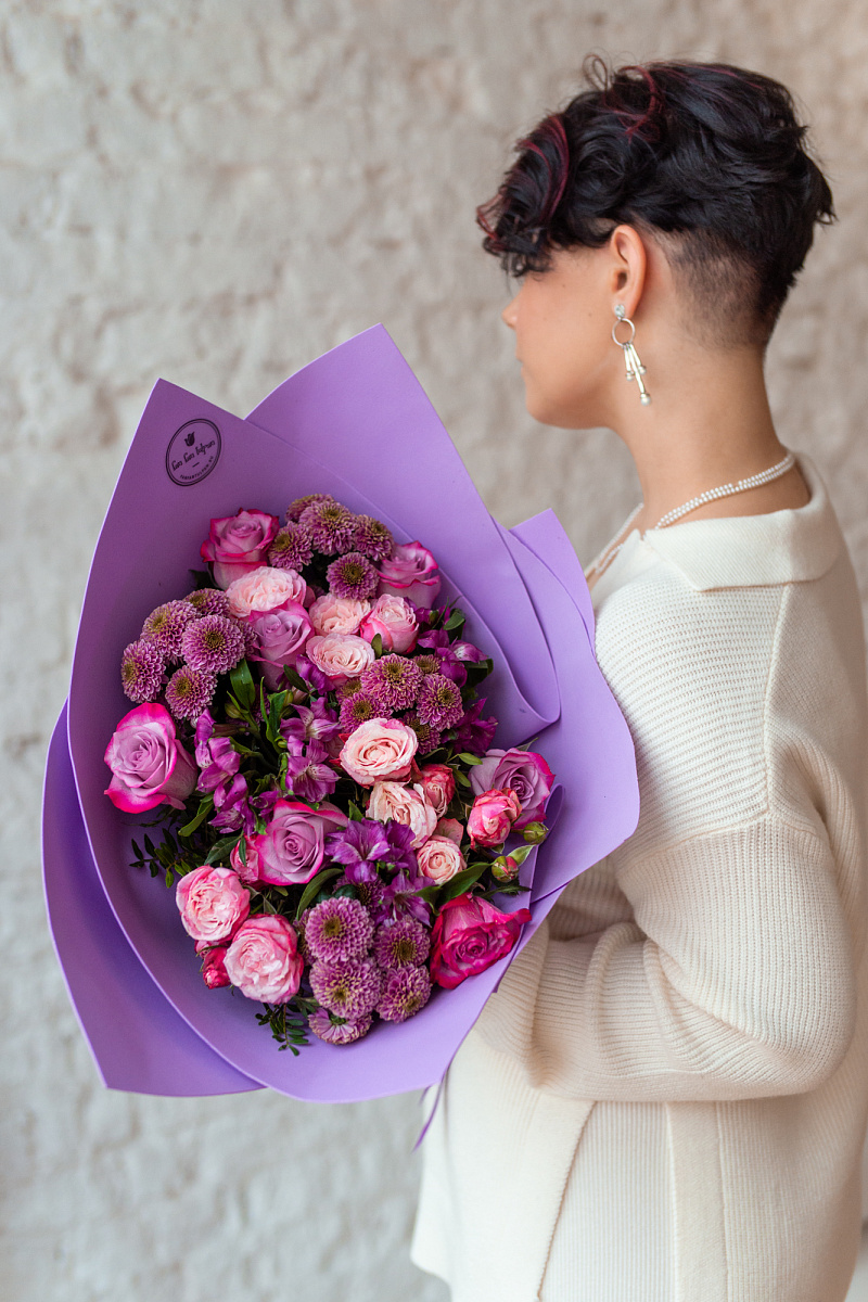 Букет включает в себя красивые лиловые розы deep purple, которые придают ему загадочности и изысканности. Их глубокий фиолетовый оттенок притягивает внимание и создает особую атмосферу. В композицию также входит прекрасная сиреневая хризантема сантини, дополняющая букет свежими и нежными нотками. Она придает ему легкости и воздушности, добавляя изящество и грацию. Наконец, кустовая роза, украшая данную композицию, придает ей еще больше роскоши и элегантности.