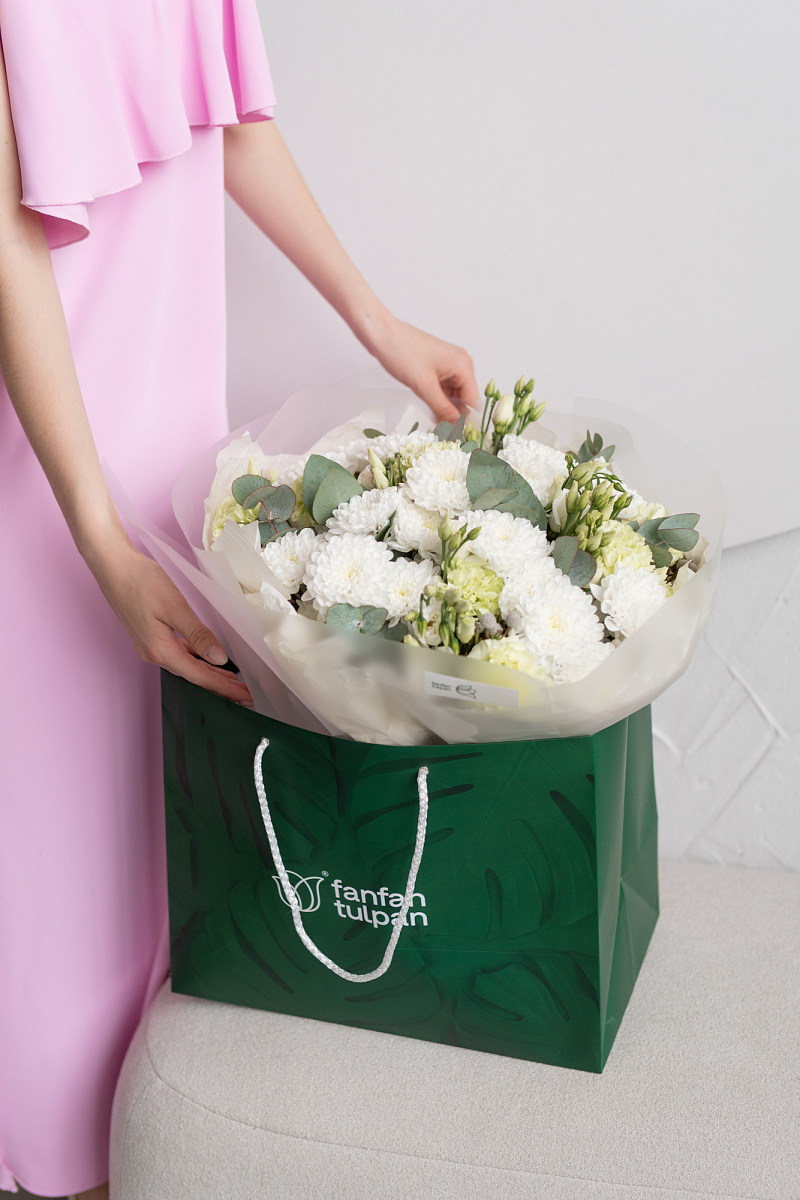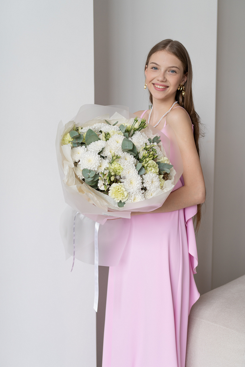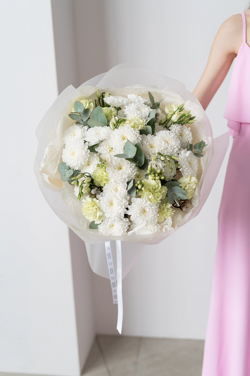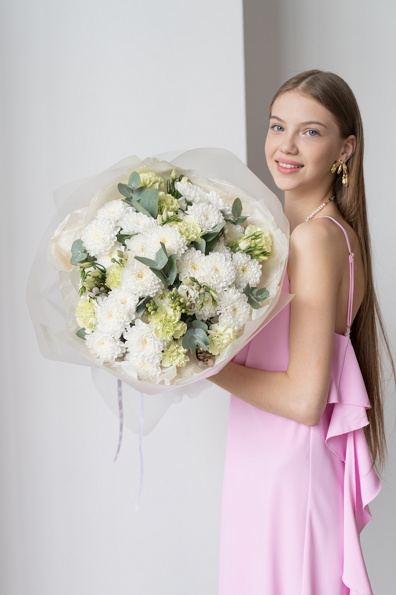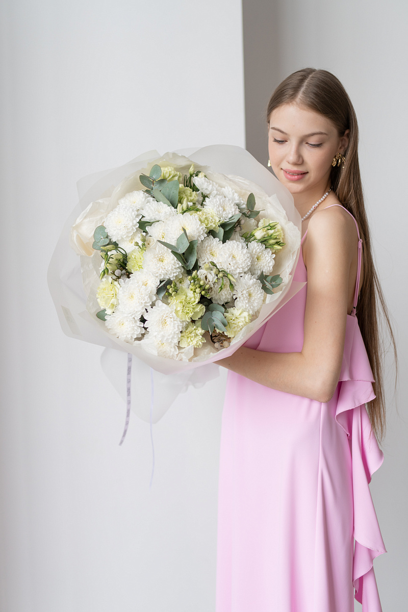 Букет с хризантемами ,кустовыми хризантемами и диантусами символизирует преданность и любовь, не только романтическую, но во всех ее проявлениях. Его также дарят, чтобы подчеркнуть обаяние и индивидуальность получательницы. Диантус в переводе с латинского означает «цветов богов» .