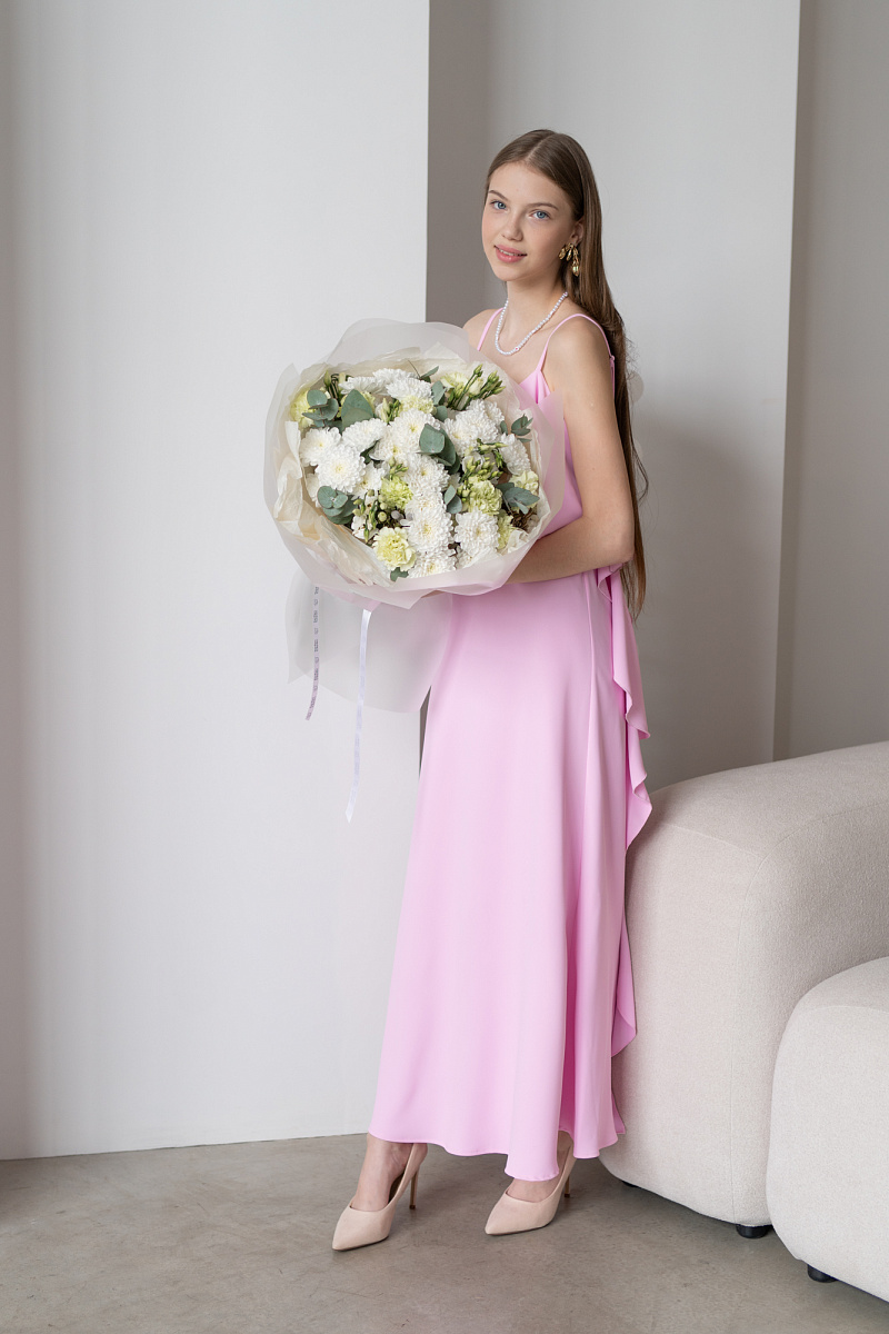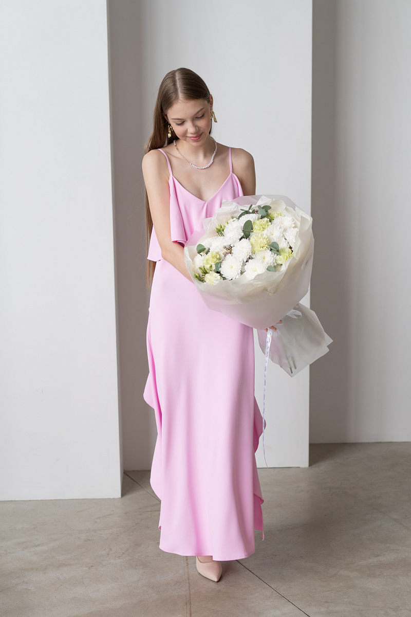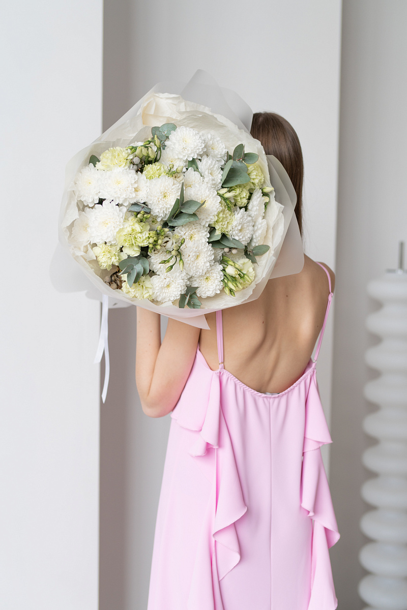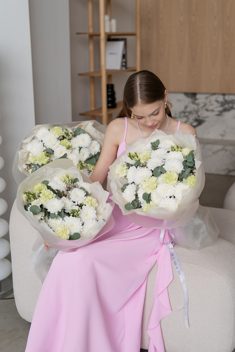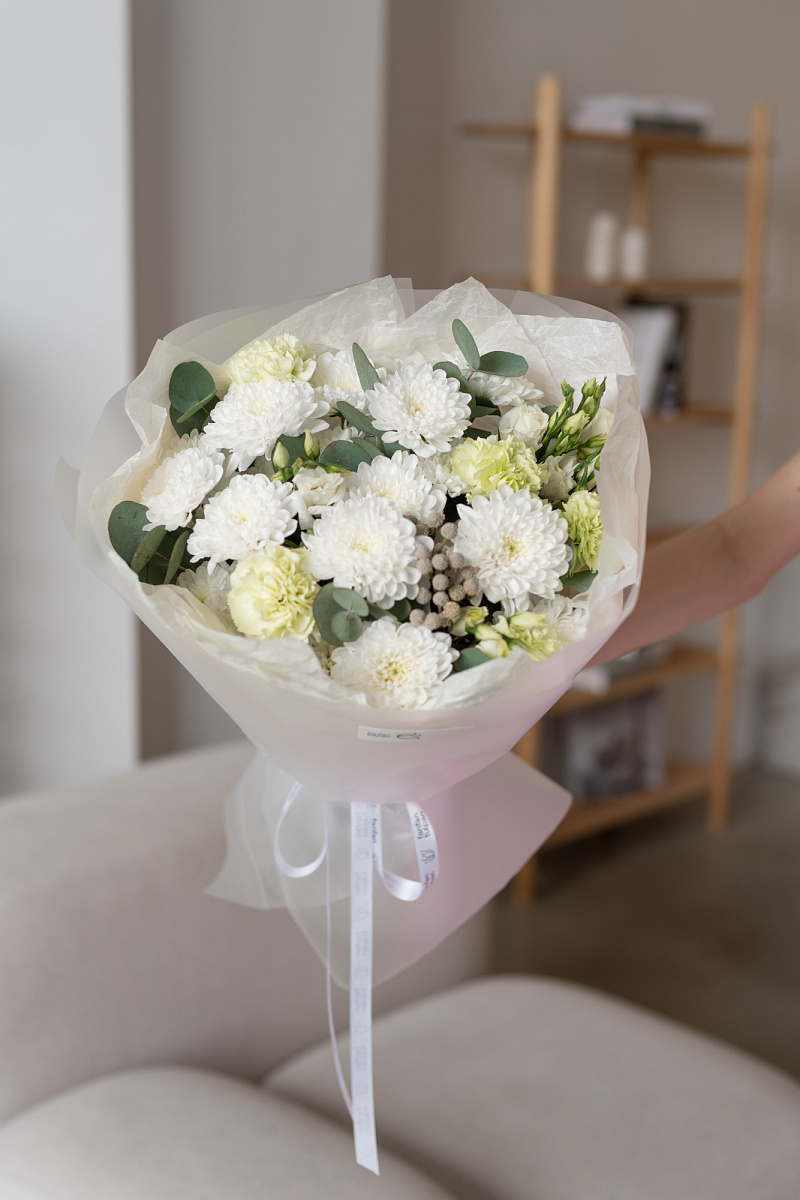 Букет с хризантемами ,кустовыми хризантемами и диантусами символизирует преданность и любовь, не только романтическую, но во всех ее проявлениях. Его также дарят, чтобы подчеркнуть обаяние и индивидуальность получательницы. Диантус в переводе с латинского означает «цветов богов» .