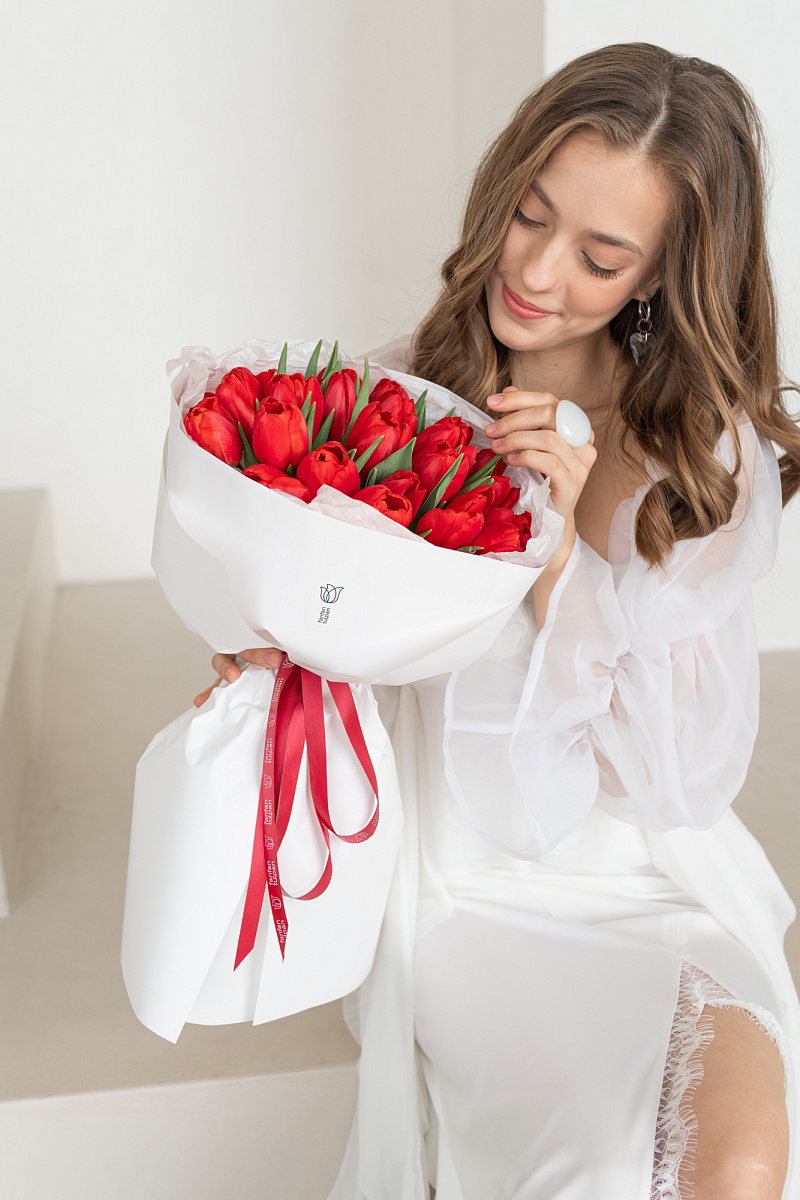 Монобукет из красных тюльпанов - воплощение страсти и элегантности. Строгая композиция с акцентом на насыщенный оттенок создаёт выразительный образ.