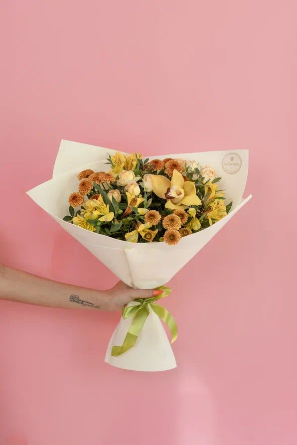 Букет представлял собой изящную композицию из желтых орхидей и коричневых сантини. Игра контрастов в этом сочетании цветов оказывала потрясающее впечатление. Желтые орхидеи, символизирующие солнечные лучи и радость, идеально гармонировали с пышными коричневыми сантини, которые придавали букету шикарный, роскошный вид.