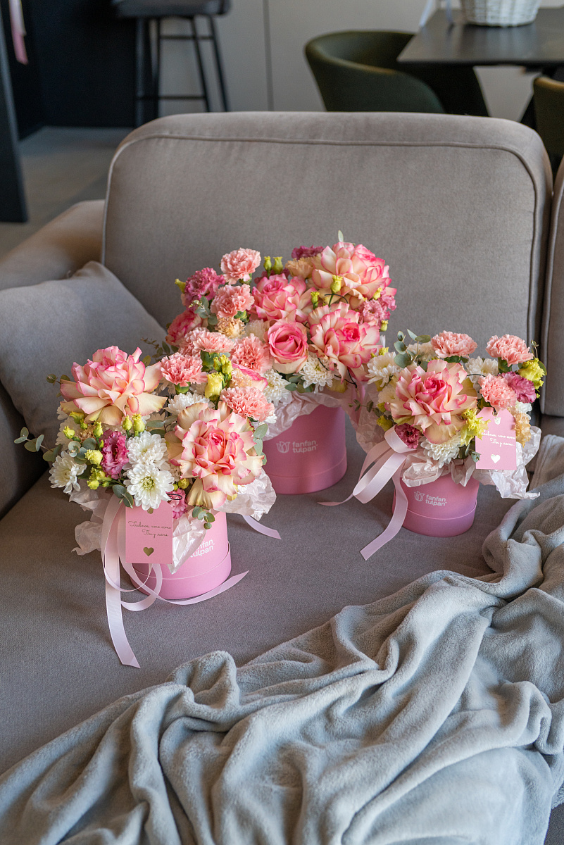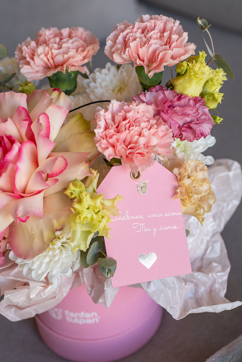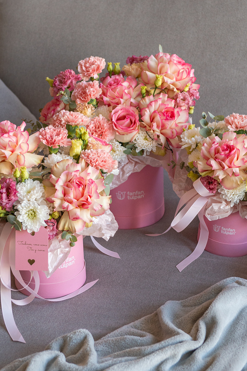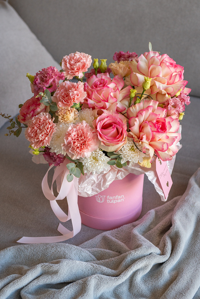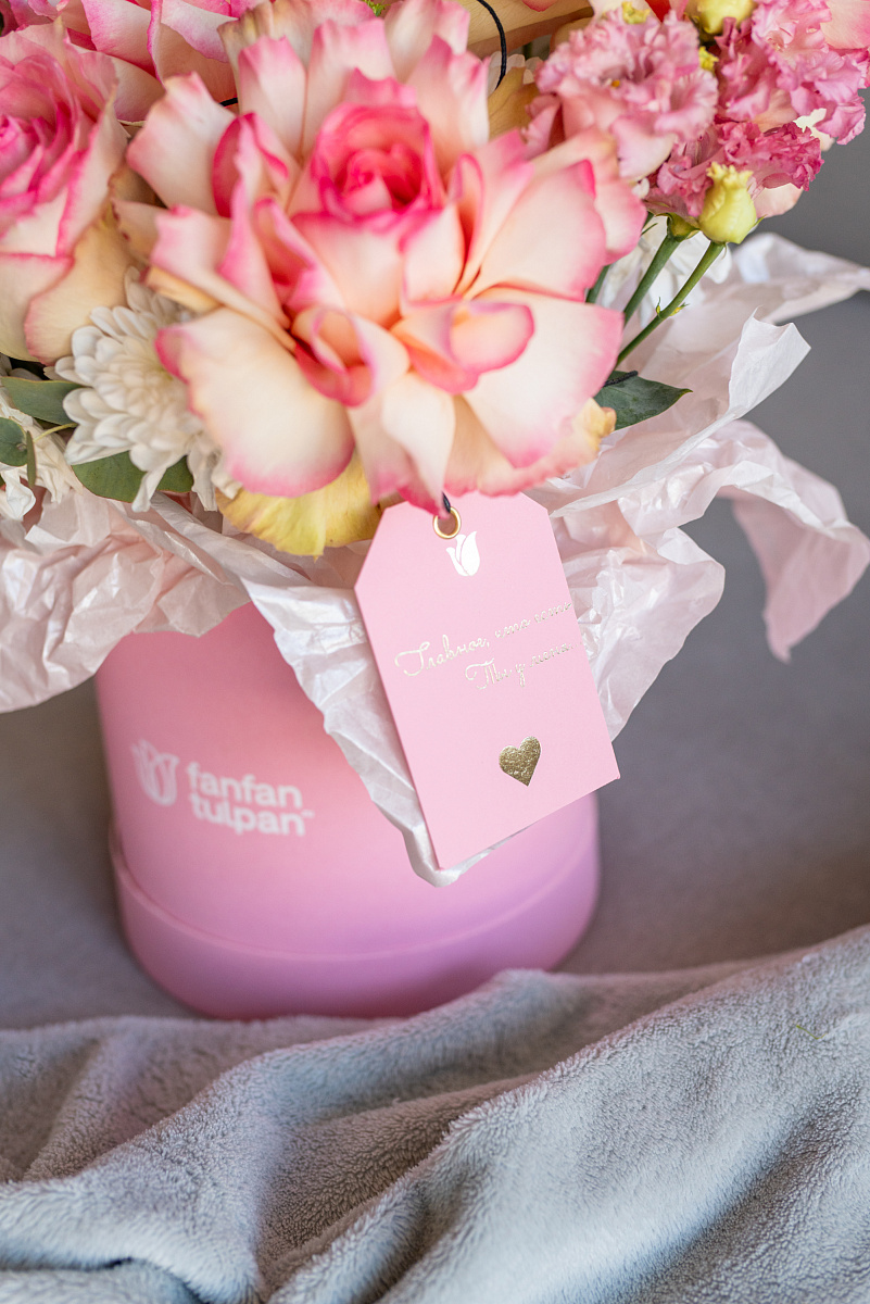 Элегантная композиция в стильной коробке - это современный флористический шедевр, где гармония форм, оттенков и текстур создает неповторимое впечатление.