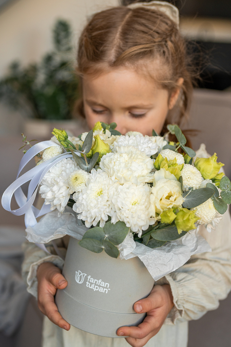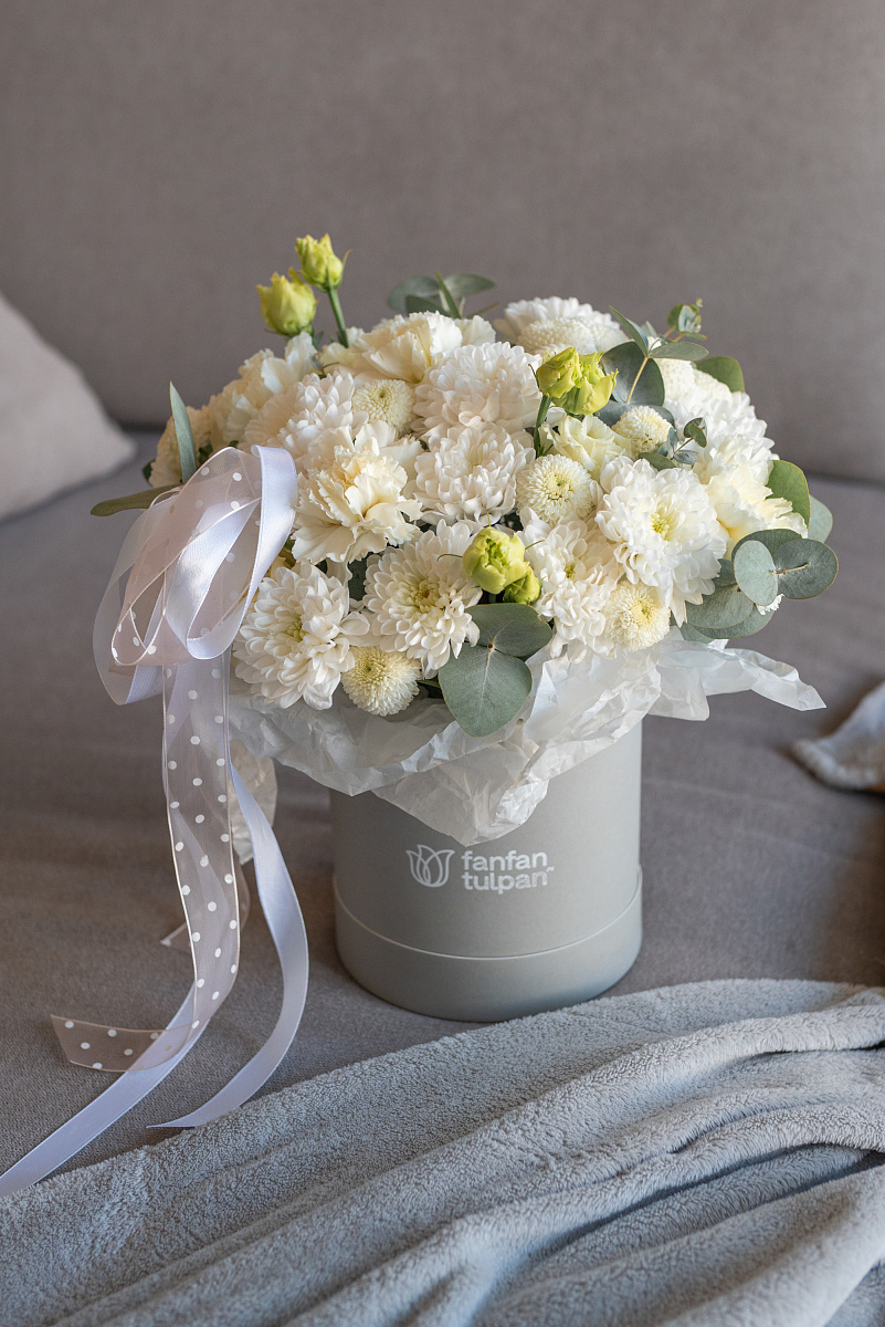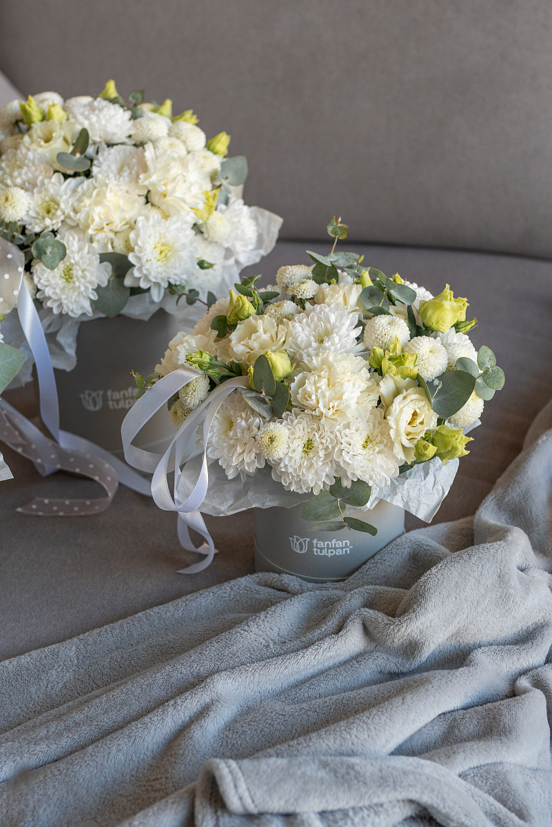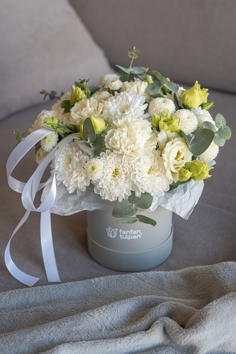 Элегантная композиция в стильной коробке - это современный флористический шедевр, где гармония форм, оттенков и текстур создает неповторимое впечатление.