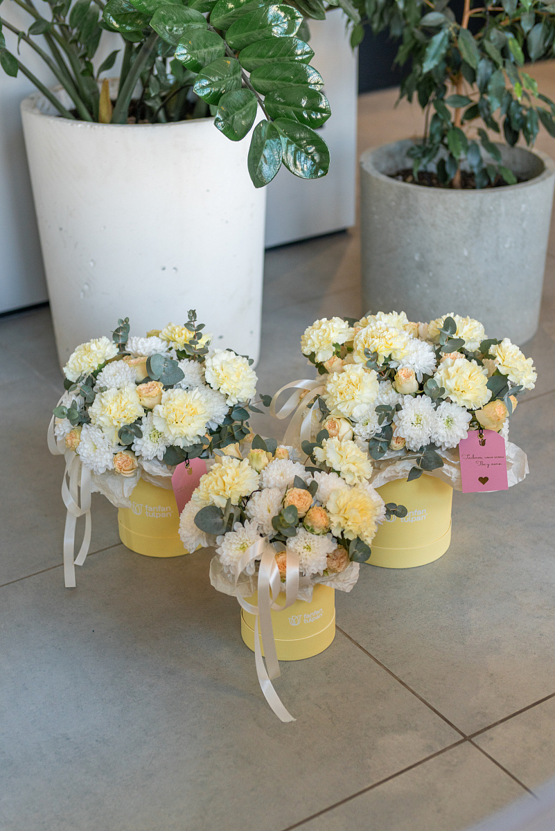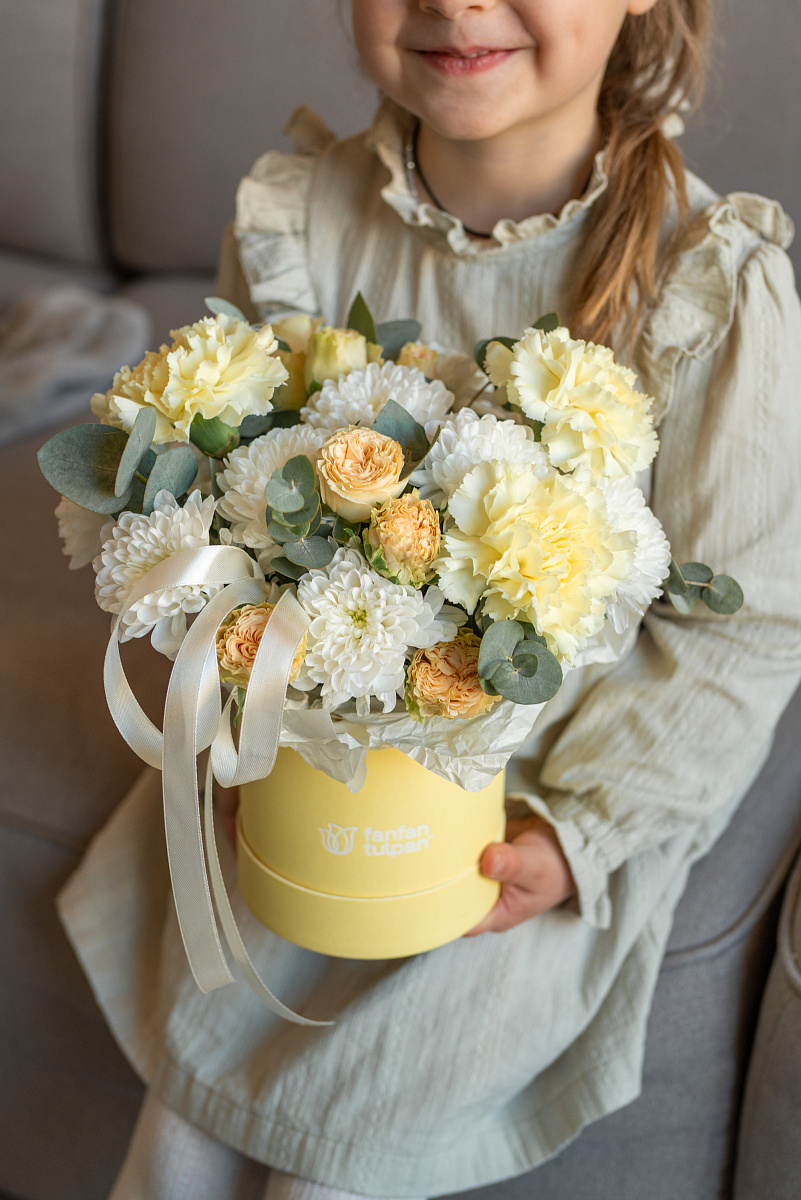 Элегантная композиция в стильной коробке - это современный флористический шедевр, где гармония форм, оттенков и текстур создает неповторимое впечатление.